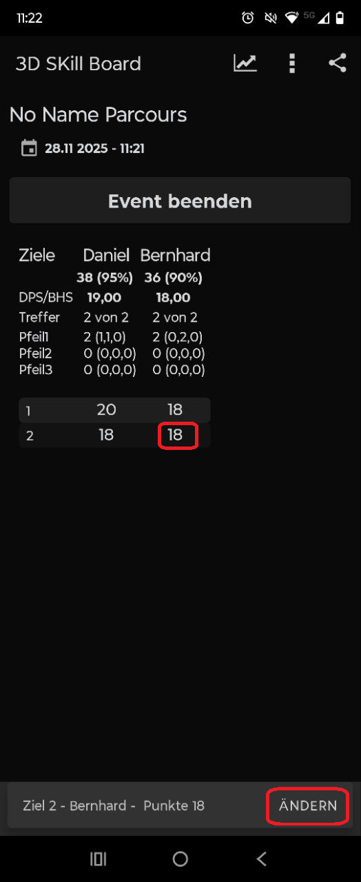 Andererseits mit einem Klick auf die Punkte in der Ergebnistabelle erscheint unten eine Leiste in der man sich versichern kannm, das richtige Element getippt zu haben. In dem Element auf "ÄNDERN" klicken -> dann kommt das Treffer Popup um die Punkte zu ändern.