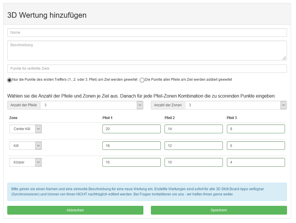 Bitte geben sie einen Namen und eine sinnvolle Beschreibung für eine neue Wertung ein. Erstellte Wertungen sind sofort für alle 3D SKill Board Apps verfügbar (Synchronisieren) und können von Ihnen NICHT nachträglich editiert werden. Es können 3 Pfeile je 6 Zonen mit unterschiedlichen Punkten erstellt werden. Und entweder zählt der erste Treffer oder die Treffer aller Pfeile werden addiert.